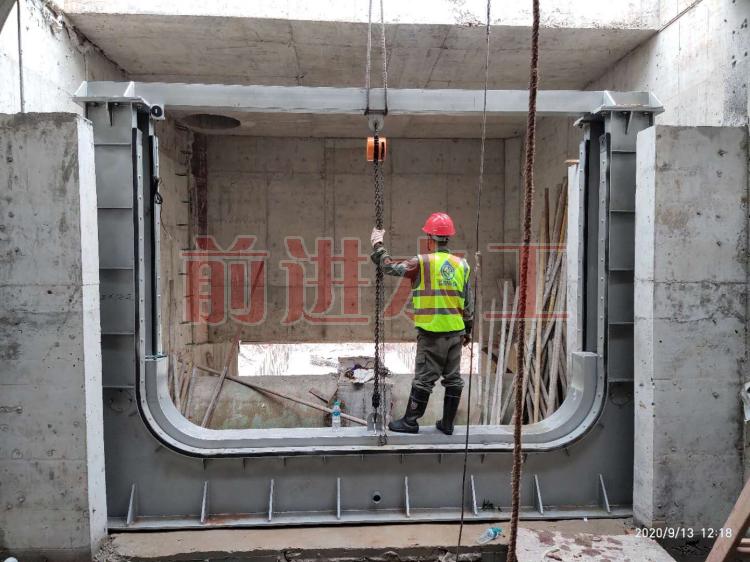 大型下開式排水堰門結構組成與工作原理: 下開式排水堰門由固定邊框、活動閘門、液壓驅動裝置、前端液位計、后端液位計,控制系統等部分組成。閘門由液壓系統驅動,能停留在行程范圍內的任意位置。通過前端液位計,閘門可對閘前水位進行調節和流量控制;通過閘門的快速下降對下游管涵進行沖洗;通過后端液位計閘門能防止下游水回灌,從而起到防倒灌的功能。