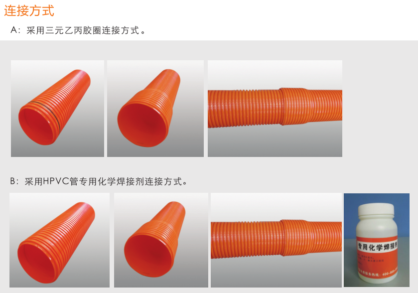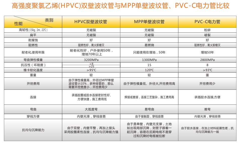 高強(qiáng)度聚氯乙烯(HPVC)雙壁波紋管內(nèi)、外壁之間呈中空環(huán)狀結(jié)構(gòu),充分利用工字鋼結(jié)構(gòu)原理,提高截面 慣性矩,環(huán)鋼度高。產(chǎn)品具有強(qiáng)度高、韌性好、質(zhì)地輕等優(yōu)點(diǎn)。產(chǎn)品運(yùn)用開挖工程,可代替MPP單壁波紋管、玻璃鋼管、PVC-C電力管、PVC-U通信管等管材。