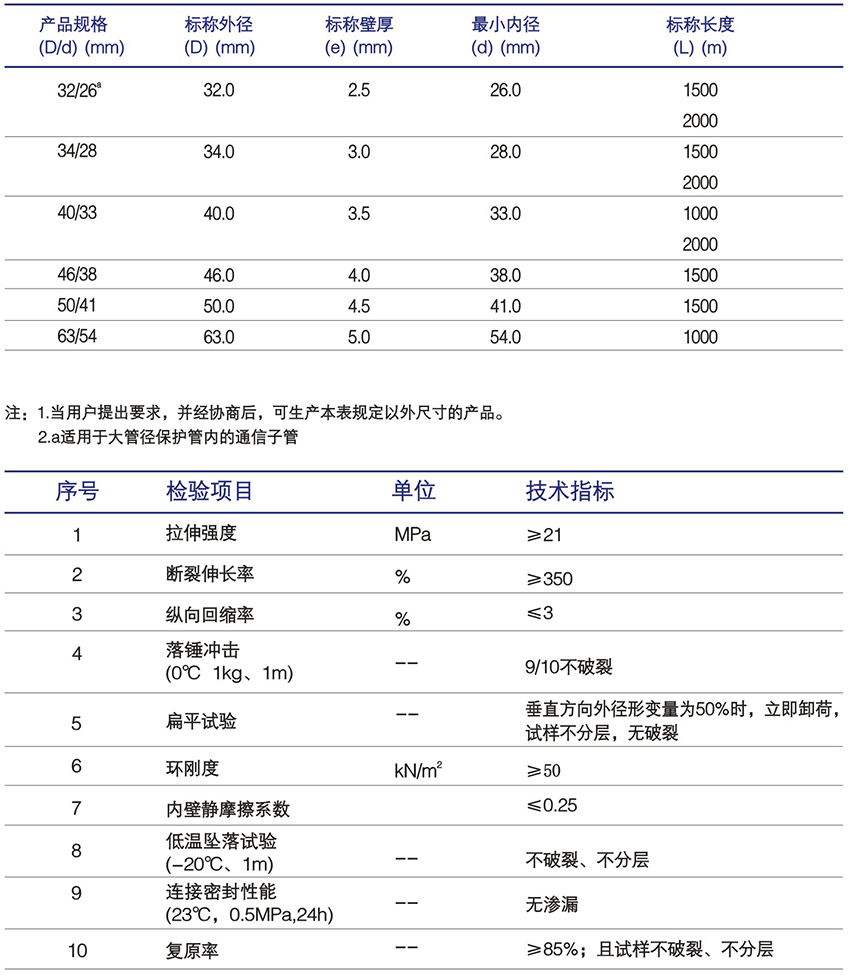 高密度聚乙烯(HDPE)硅芯管內外壁應清潔、光滑,不允許有氣泡、明顯的劃傷、凹陷、雜質、顏色不均等缺陷。管端頭應切割平整,并與管軸線垂直。 硅芯內壁應緊密熔接、無開脫現象。管材內外壁標示清楚。