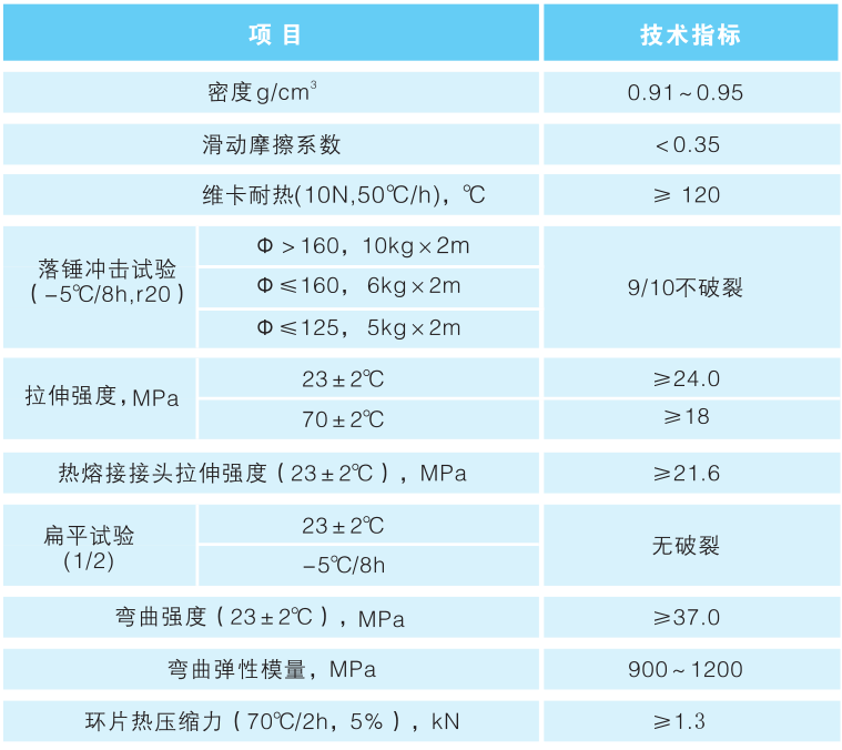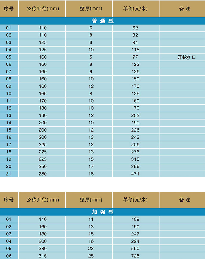 韌性好,具有優(yōu)良的抗地層沉降及抗震性能。常用管材分為普通型和加強型。普通型適用于開挖鋪設施工和非開挖穿越施工埋深小于4米的工程;加強型用于非開挖穿越施工埋深大于4米的工程。